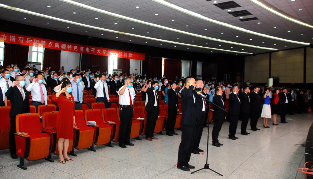马智群带领全体干部和教职员工,举起右手握拳,面向国旗,庄严宣誓:“忠诚党的教育事业,贯彻党的教育方针,落实立德树人根本任务……”