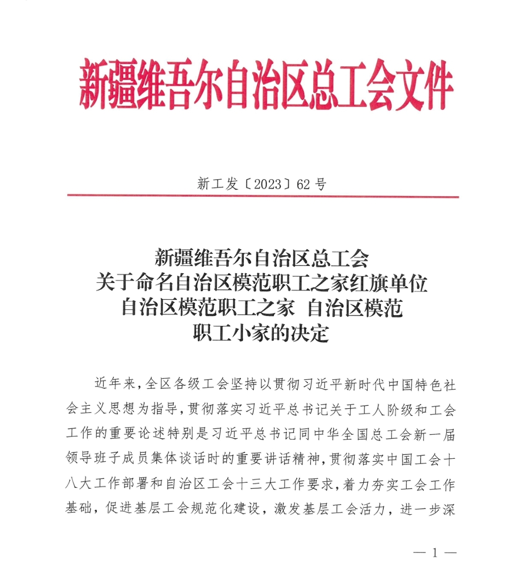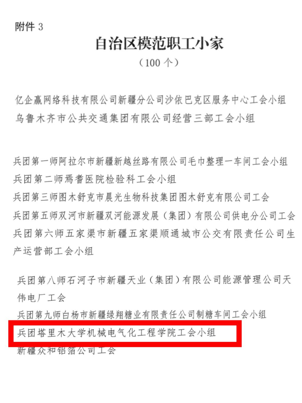 近日,新疆维吾尔自治区总工会下发了《新疆维吾尔自治区总工会关于命名自治区模范职工之家红旗单位自治区模范职工之家自治区模范职工小家的决定》,自治区总工会命名100个自治区模范职工小家。我校机械电气化工程学院工会荣获自治区模范职工小家称号。