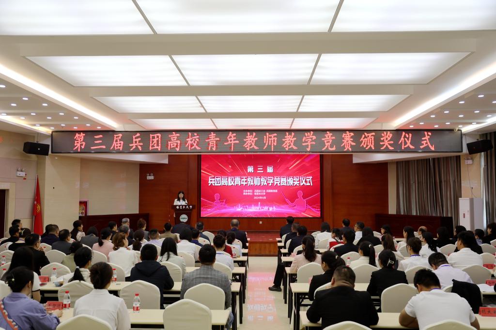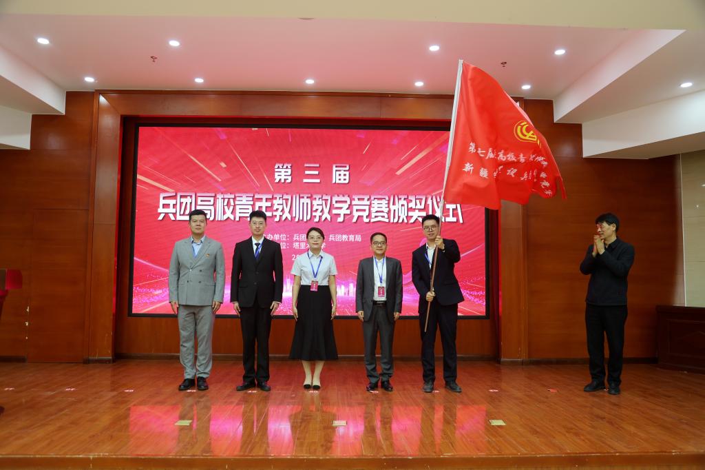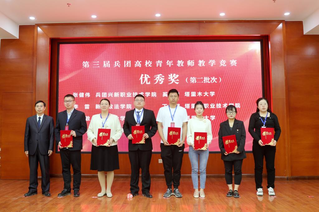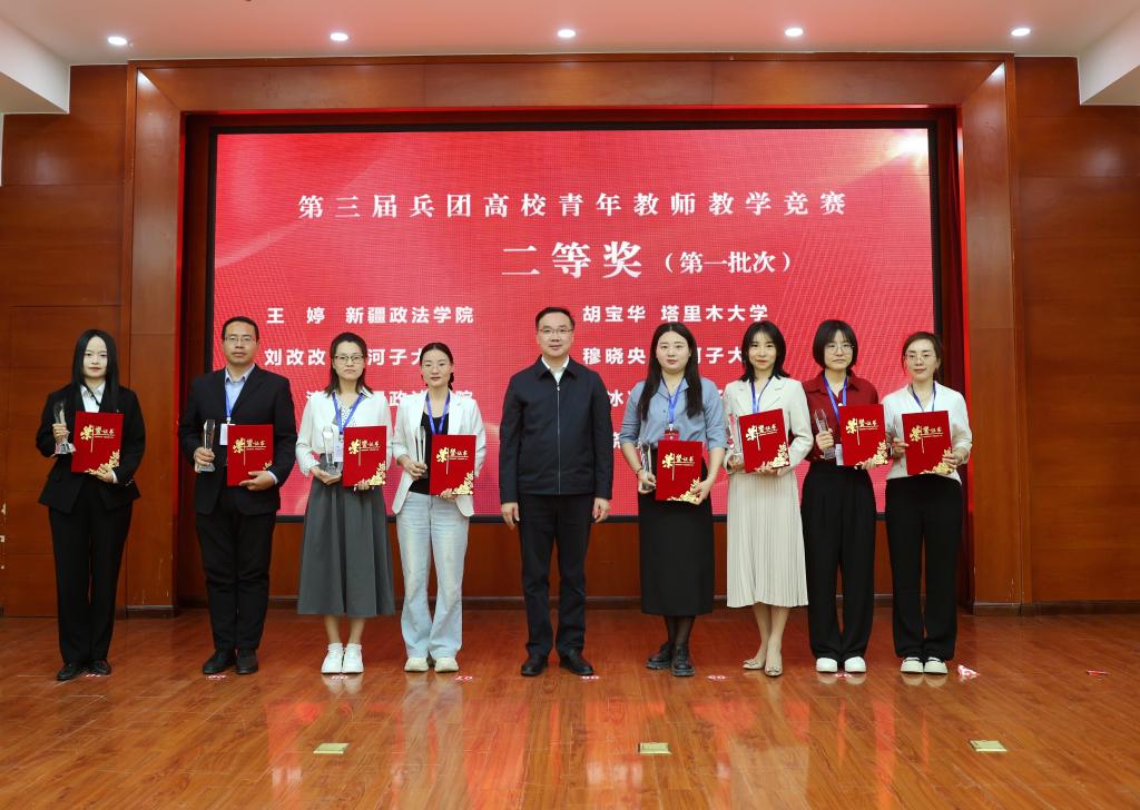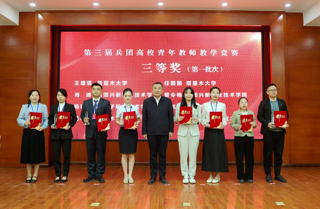 石长青宣读了《兵团总工会 兵团教育局关于第三届兵团高校青年教师教学竞赛获奖情况的通报》。与会领导尤益民、闫祥林、石长青、谢建新、马召伟,共同为获奖教师和优秀组织单位进行了颁奖。