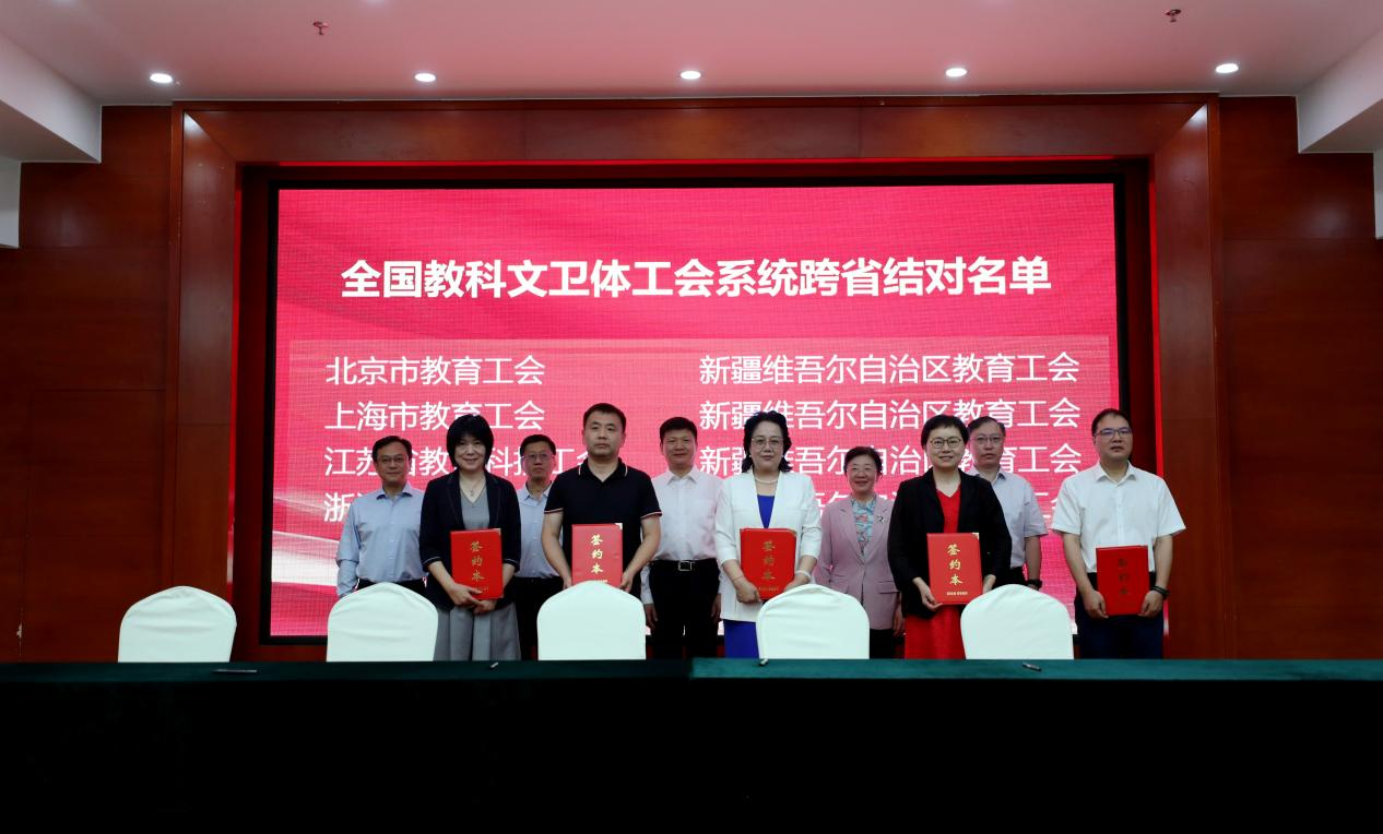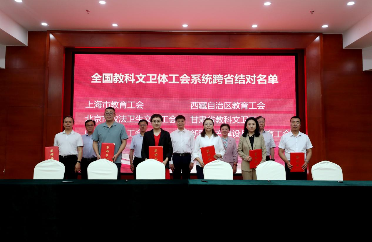 上海市教育工会与西藏自治区教育工会,北京市政法卫生文化工会与甘肃省教科文卫工会,山东省医务工会与新疆生产建设兵团教育工会进行签约