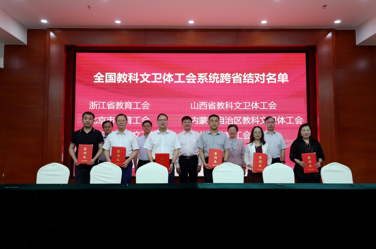 浙江省教育工会与山西省教科文卫体工会,北京市教育工会与内蒙古自治区教科文卫体工会,广东省教科文卫工会与贵州省教育工会进行签约
