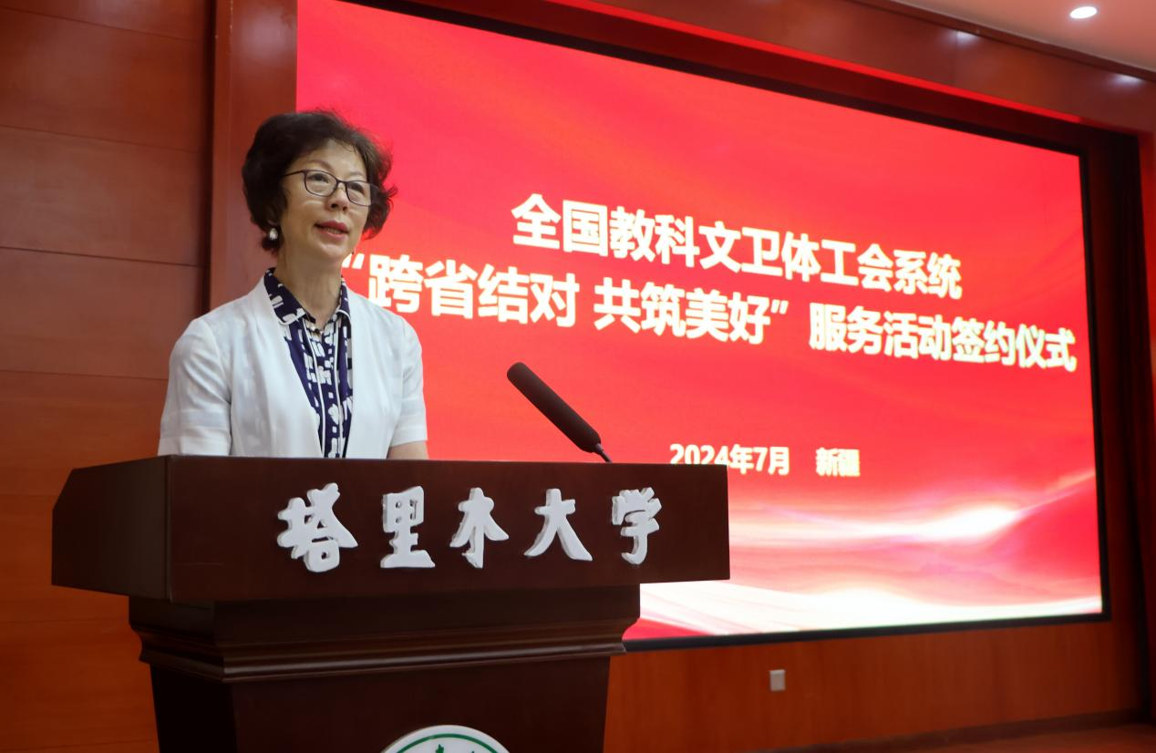 7月10日上午,全国教科文卫体工会系统“跨省结对 共筑美好”服务活动签约仪式在胡杨干部培训中心二楼报告厅举行。全国总工会党组成员、经费审查委员会主任蔡安辉,中国教科文卫体工会主席、分党组书记高洁,新疆生产建设兵团总工会党组书记、主席李江,全总经费审查委员会办公室副主任臧朝晖,塔里木大学党委常委、副校长林松涛出席仪式并见证签约。中国科协机关党委副书记杨绍丽主持签约仪式。来自14个省区市的16个单位分4轮签订了跨省结队帮扶协议,开启了为期三年的结对帮扶工作。内蒙古自治区教科文卫体工会、安徽省教科文卫体工会、广东省教科文卫工会、青海省教科文卫体工会、新疆维吾尔自治区教育工会围绕结对帮扶工作分别进行了交流发言。