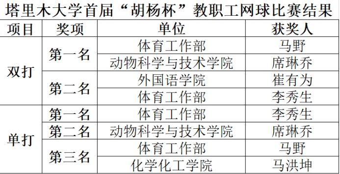 经过激烈角逐,体育工作部马野、动物科学与技术学院席琳乔获得双打项目第一名,体育工作部李秀生获得单打项目第一名。学校工会主席、妇委会主任张燕飞,体育工作部副主任、校工会副主席王锋,校工会副主席、人文学院教务办公室主任肖克来提·海依来提,为获奖教职工颁奖。