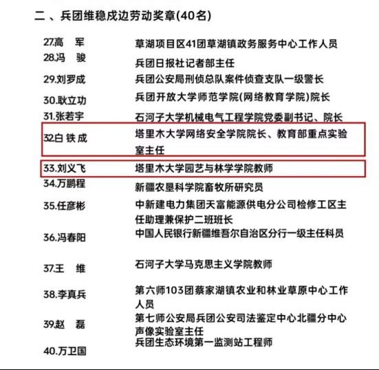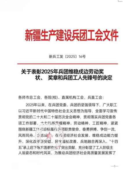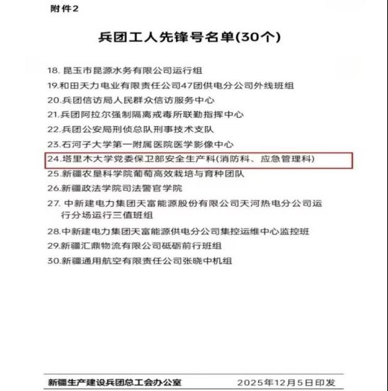 近日,为表彰先进、树立典型,进一步增强新时代工人阶级的自豪感和使命感,营造劳动光荣、知识崇高、人才宝贵、创造伟大的社会风尚,兵团总工会决定,授予30个班组(科室)2025年兵团工人先锋号,授予40名同志2025年兵团维稳戍边劳动奖章。我校党委保卫部安全生产科(消防科、应急管理科)荣获2025年兵团工人先锋号,网络安全学院院长、教育部重点实验室主任白铁成,园艺与林学学院教师刘义飞荣获2025年兵团维稳戍边劳动奖章。
