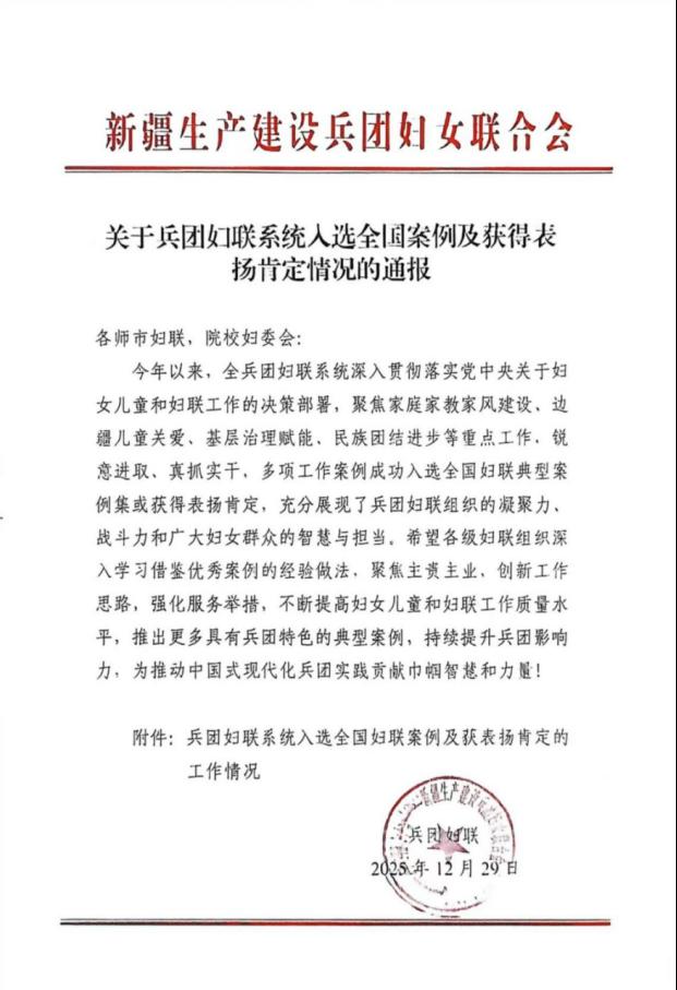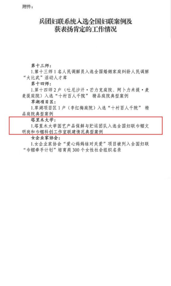 近日,兵团妇联对兵团妇联系统入选全国案例及获得表扬肯定情况进行通报,我校食品科学与工程学院王萍老师的塔里木大学园艺产品保鲜与贮运团队入选全国妇联巾帼文明岗和巾帼科创工作室联建情况典型案例。