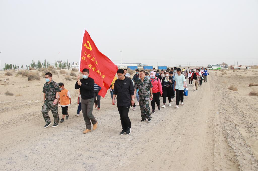 徒步活动开始后,大家迈着矫健的步伐、呼吸着新鲜的空气、沿途浏览沙漠戈壁独有的风景,感受着春天的气息。大家相互鼓励,用脚步丈量信仰,感悟长征精神。从沙漠边缘出发,在沙漠徒步3公里,最终到达红色影视基地。影视基地以红色经典、兵团记忆、地窝子为主题,真实的还原了当年兵团开荒造田的生活工作场景。在荒凉的戈壁滩上,十几个用土坯或砖瓦垒起的地窝子连成一片,简陋的牌楼上写着“英雄连”三个大字,上方一颗红色五角星格外显眼,大家一边参观,一边表示要加倍努力,传承不怕苦、不怕累,艰苦创业、无私奉献的精神。