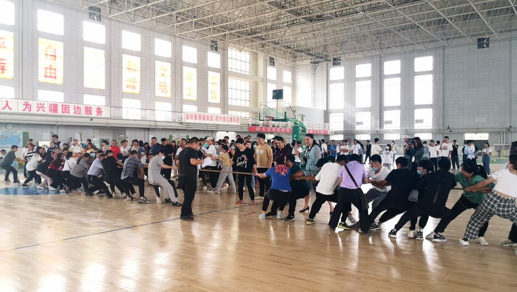 活动在一曲欢快的维吾尔族舞蹈中拉开序幕,仿佛绚烂的花朵绽放在师生们的心中。第一项活动为“拔河热身赛”,现场的师生自由组队,快速形成20人的团队,两两PK,现场呐喊加油声接连不断,瞬间将活动氛围推向了高潮。紧接着是3个现场组队小游戏,交友师生通过组成4人团队自由参加活动,通过游戏实现团队共同目标。其中,为了加强交友师生对党史、新中国史和校史的认识,特在游戏“旋转地球”中设置了小知识快速答题环节,进一步丰富了此次活动的内涵。