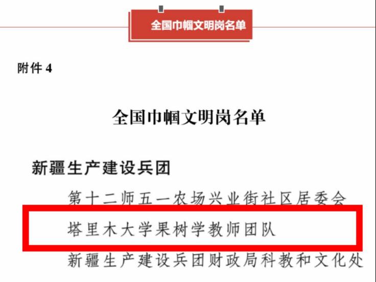 近日,为表彰先进、树立榜样,充分发挥先进典型和模范人物示范作用,全国妇联决定,授予9人全国三八红旗手标兵称号,授予598人全国三八红旗手称号,授予400个单位全国三八红旗集体称号,授予600个单位全国巾帼文明岗称号。塔里木大学果树学教师团队荣获2025年度全国巾帼文明岗称号。