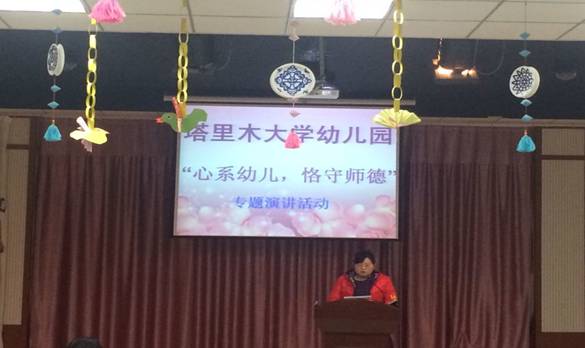 最近“虐童事件”频发,每当看到这样的新闻,作为同行的我们,非常愤怒、痛心。种种虐童事件的发生不仅是在伤害幼儿的身体,伤害家长的内心,更是在破坏幼儿教师的公众形象。虐童事件的发生也给幼儿园及老师们敲响了警钟,我园将严格执行各项管理制度、加强师德师风建设、接受家长和社会的监督。希望虐童事件不再发生,还孩子们一个快乐的童年。抵制虐童事件,从我们每个幼教人做起! 2017年12月8日,塔里木大学幼儿园利用周五中午时间开展了“心系幼儿,恪守师德”专题演讲活动。加强教师队伍师德师风建设,树立严于律己、爱岗敬业、为人师表的良好教师形象。不断提高全园教师教书育人的光荣感、责任感和使命感。